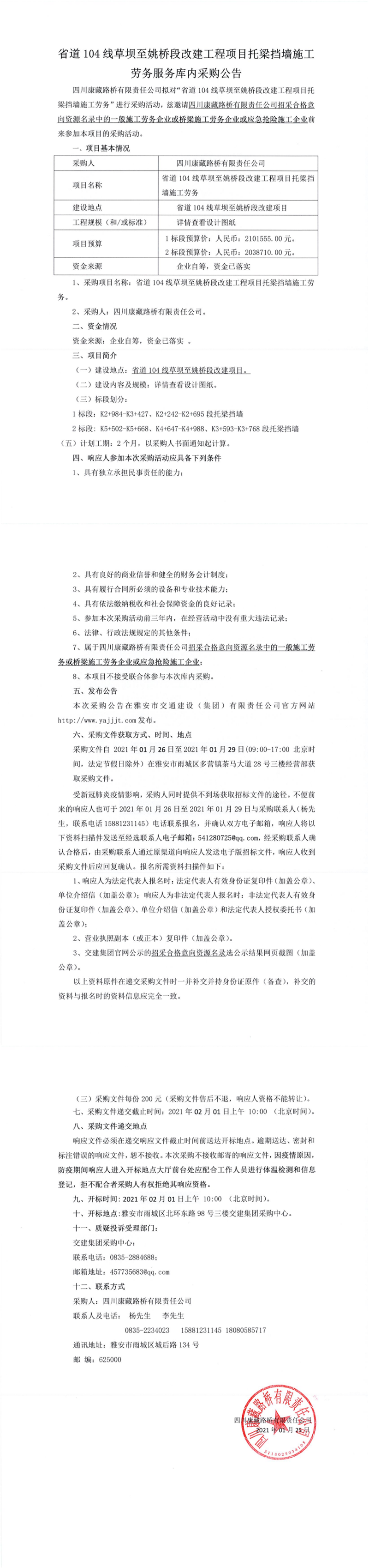 四川康藏路橋有限責(zé)任公司省道104線草壩至姚橋段改建工程項目托梁擋墻施工勞務(wù)服務(wù)庫內(nèi)采購公告