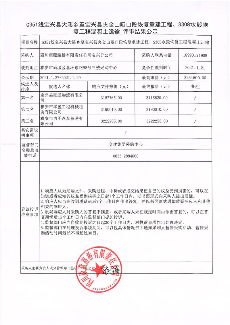 四川康藏路橋有限責任公司寶興分公司G351線寶興縣大溪鄉(xiāng)至寶興縣夾金山啞口段恢復重建工程、S308水毀恢復工程混凝土運輸評審結果公示