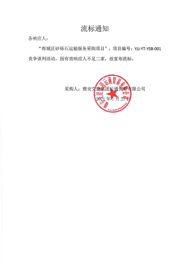 雅安交建集團運通貿(mào)易有限公司雨城區(qū)砂礫石運輸服務(wù)采購項目流標通知
