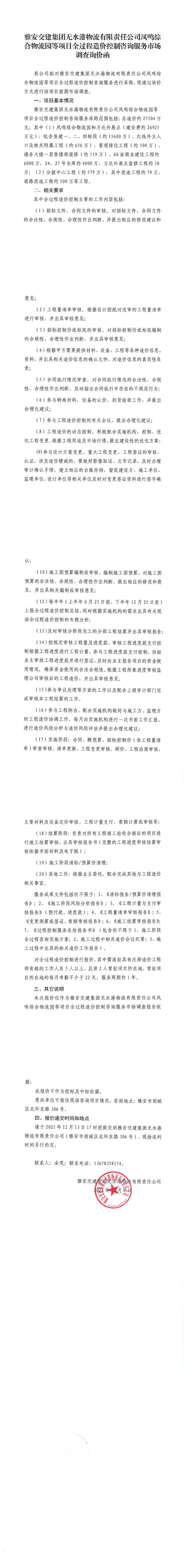 雅安交建集團無水港物流有限責任公司鳳鳴綜合物流園等項目全過程造價控制咨詢服務市場調查詢價函
