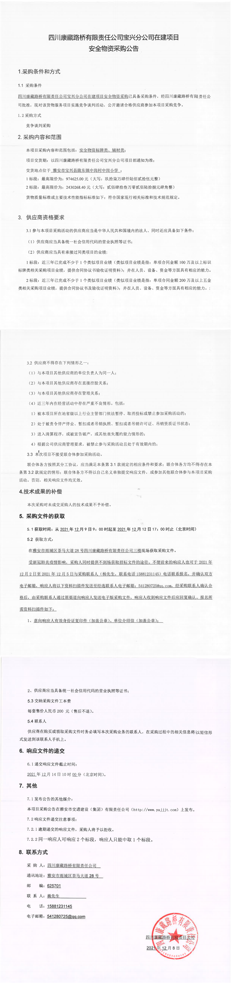 四川康藏路橋有限責(zé)任公司寶興分公司在建項目安全物資采購