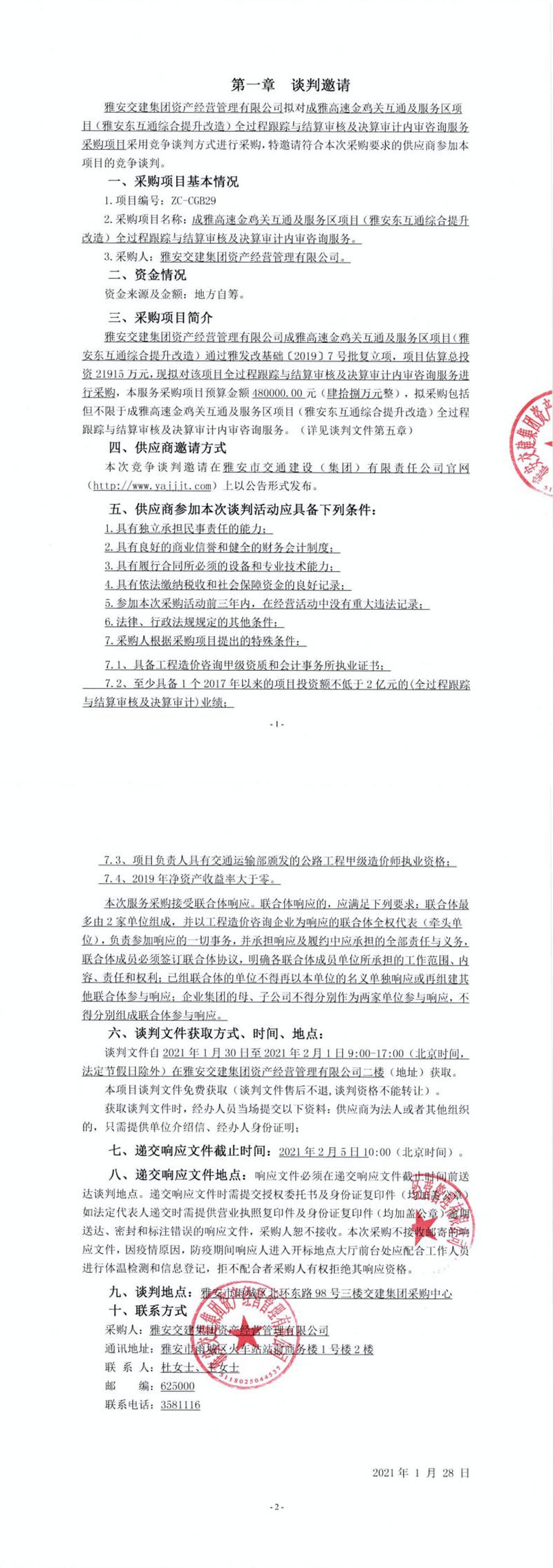 雅安交建集團(tuán)資產(chǎn)經(jīng)營管理有限公司成雅高速金雞關(guān)互通及服務(wù)區(qū)項(xiàng)目(雅安東互通綜合提升改造)全過程跟蹤與結(jié)算審核及決算審計(jì)內(nèi)審咨詢服務(wù)談判公告