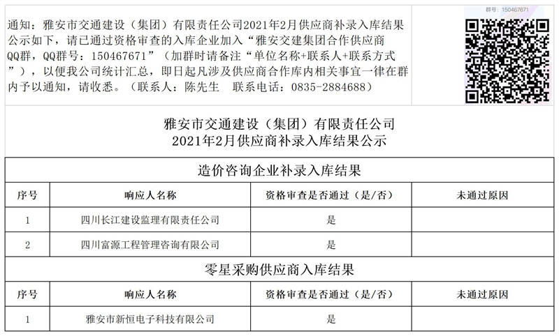 雅安市交通建設(集團)有限責任公司2021年2月供應商補錄入庫結果公示