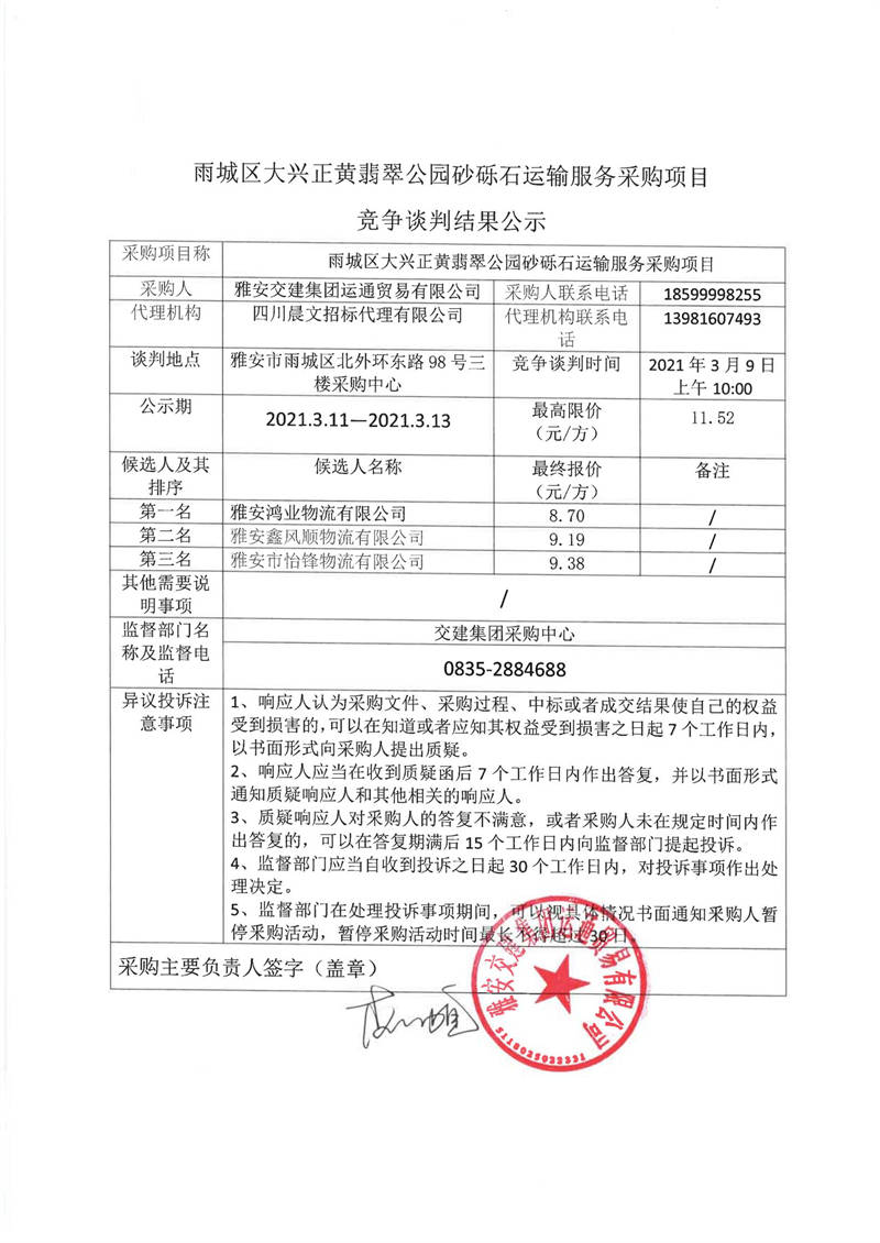 雅安交建集團(tuán)運(yùn)通貿(mào)易有限公司雨城區(qū)大興正黃翡翠公園砂礫石運(yùn)輸服務(wù)采購項(xiàng)目競爭談判結(jié)果公示