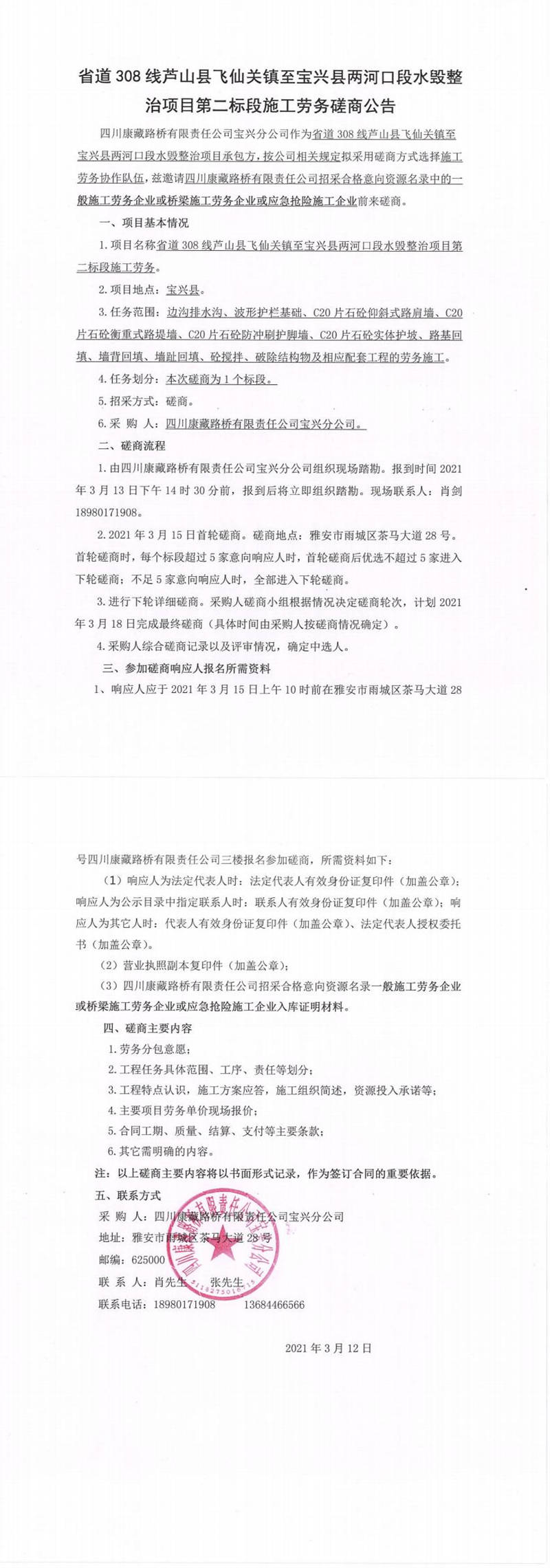 四川康藏路橋有限責(zé)任公司寶興分公司省道308線(xiàn)蘆山縣飛仙關(guān)鎮(zhèn)至寶興縣兩河口段水毀整治項(xiàng)目第二標(biāo)段施工勞務(wù)磋商公告
