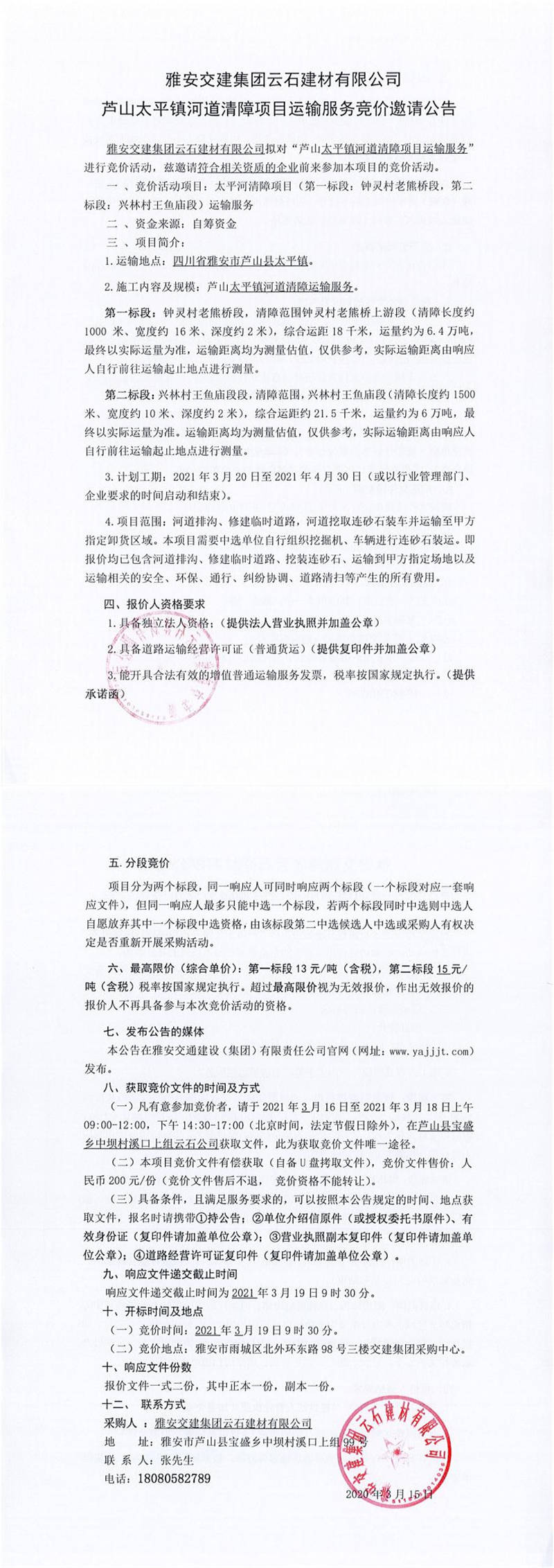 雅安交建集團(tuán)云石建材有限公司蘆山太平鎮(zhèn)河道清障項(xiàng)目運(yùn)輸服務(wù)競(jìng)價(jià)邀請(qǐng)公告
