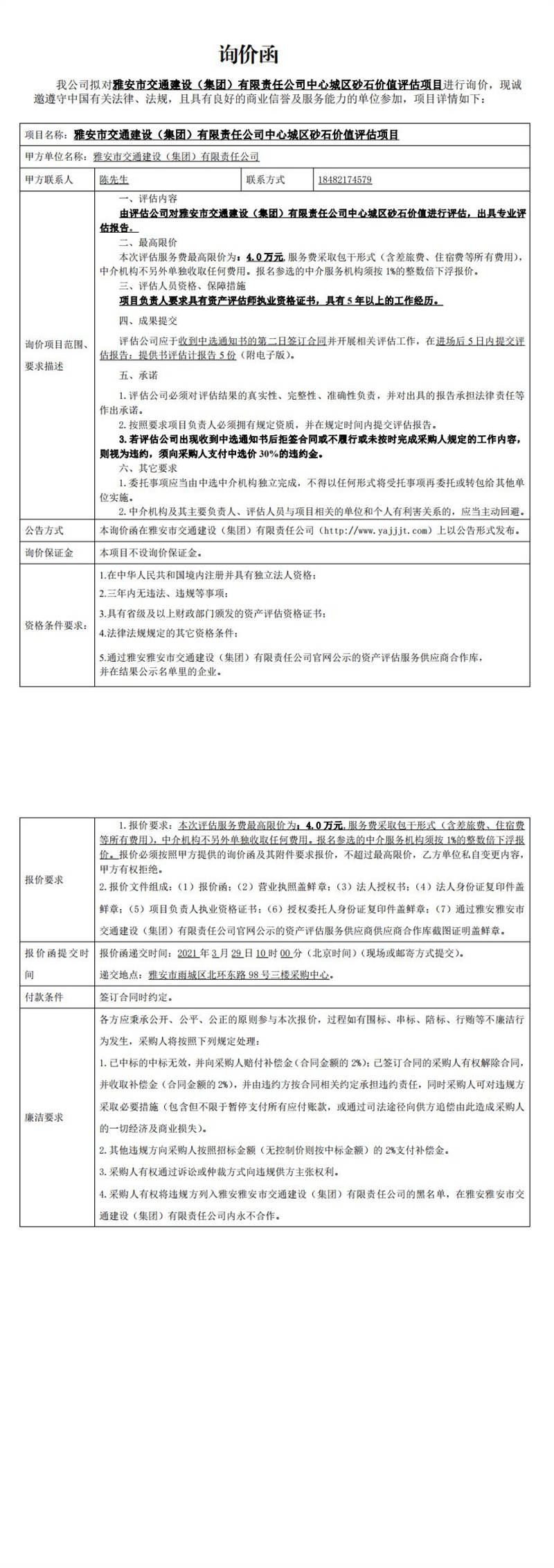 雅安市交通建設(shè)(集團)有限責(zé)任公司中心城區(qū)砂石價值評估項目詢價函