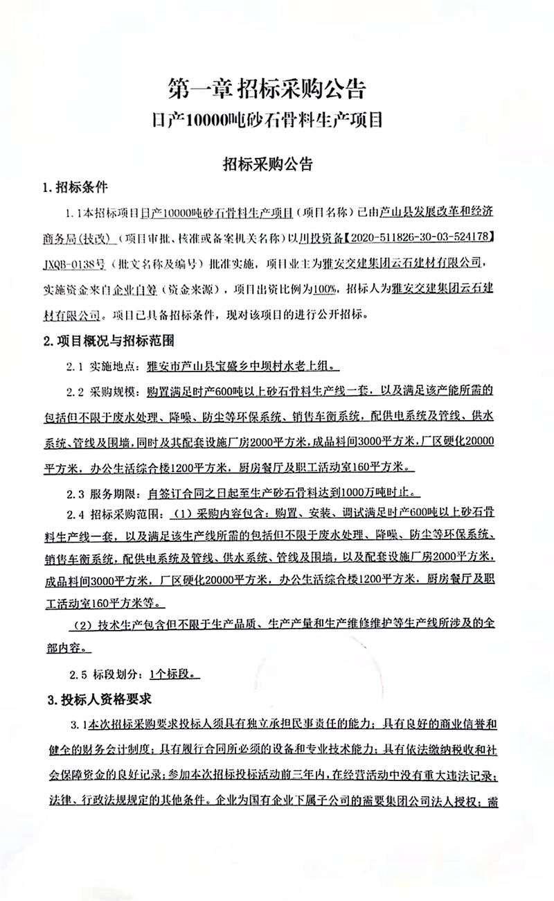 雅安交建集團(tuán)云石建材有限公司日產(chǎn)10000噸砂石骨料生產(chǎn)項(xiàng)目招標(biāo)采購(gòu)公告