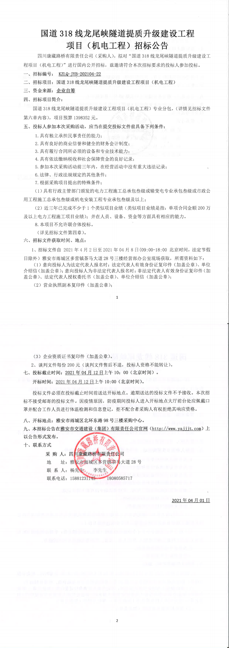 四川康藏路橋有限責(zé)任公司國道318線龍尾峽隧道提質(zhì)升級建設(shè)工程項目(機電工程)招標公告