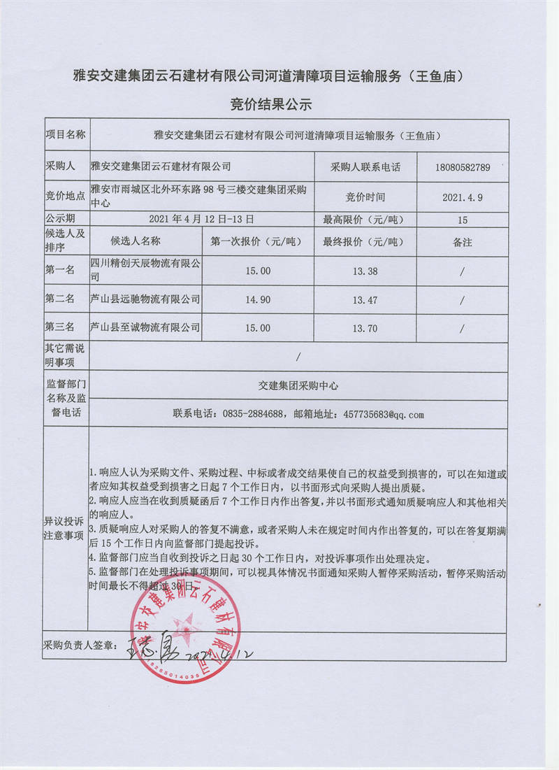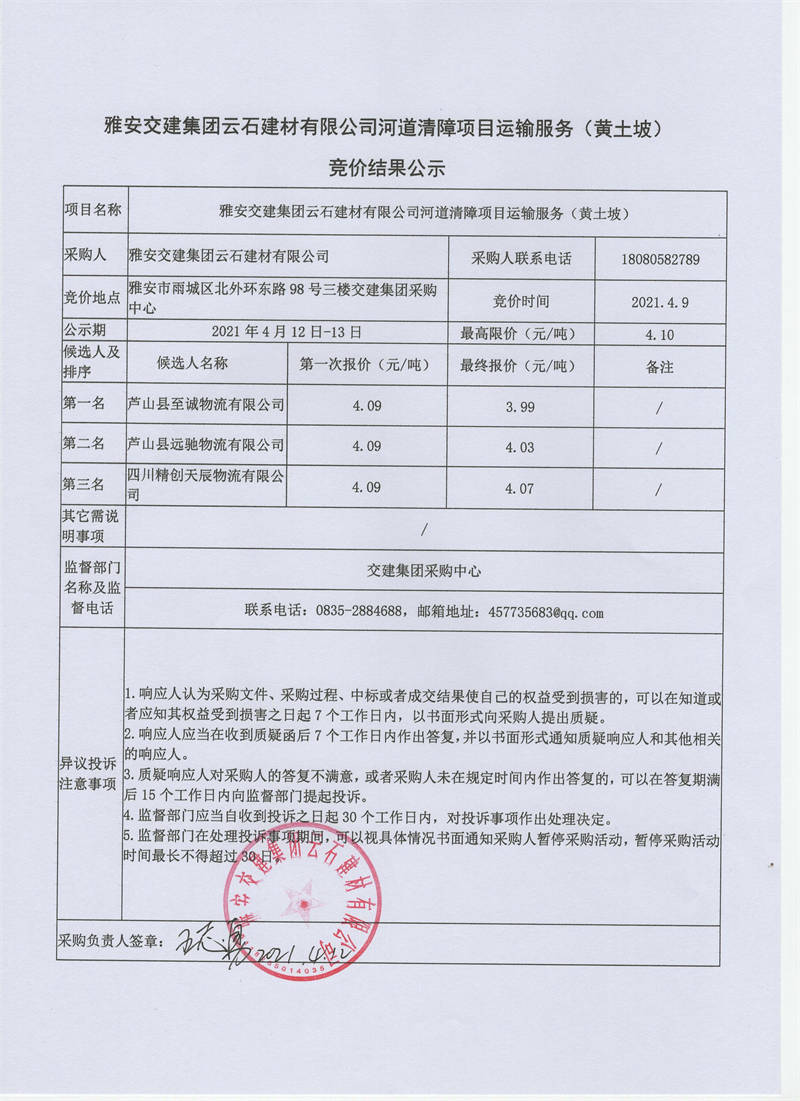 雅安交建集團(tuán)云石建材有限公司河道清障項(xiàng)目運(yùn)輸服務(wù)競價(jià)結(jié)果公示
