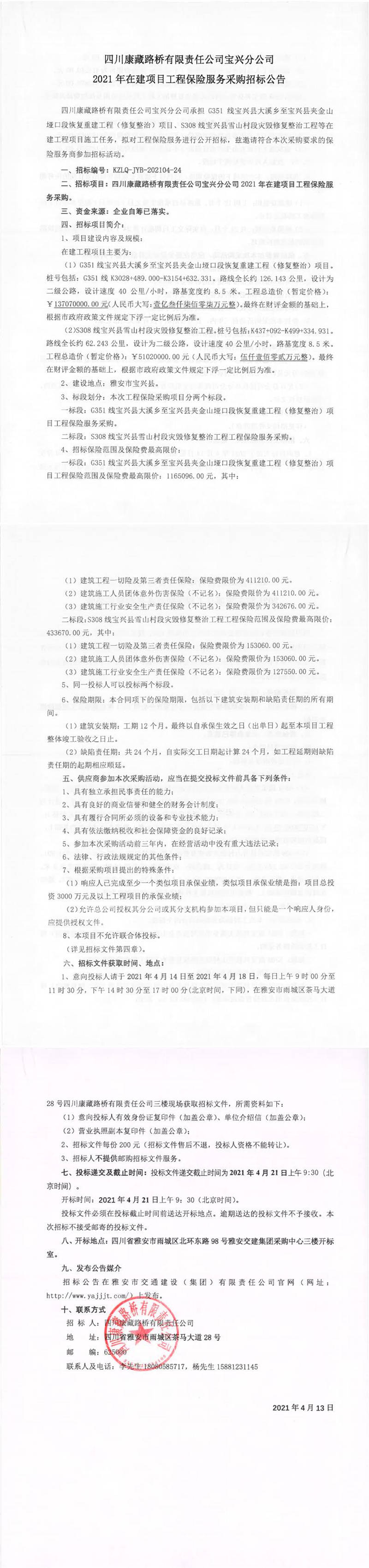 四川康藏路橋有限責(zé)任公司寶興分公司2021年在建項(xiàng)目工程保險(xiǎn)服務(wù)采購招標(biāo)公告