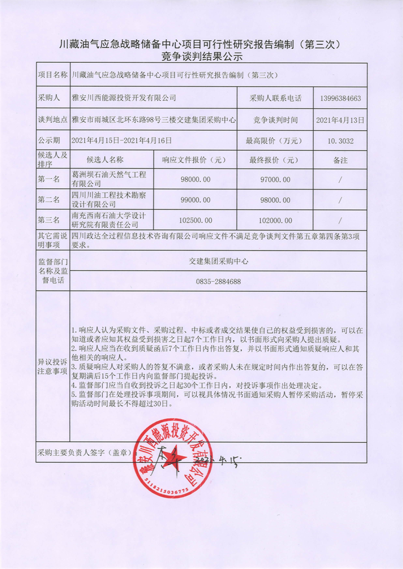雅安川西能源投資開(kāi)發(fā)有限公司川藏油氣應(yīng)急戰(zhàn)略?xún)?chǔ)備中心項(xiàng)目可行性研究報(bào)告編制 (第三次)競(jìng)爭(zhēng)談判結(jié)果公示