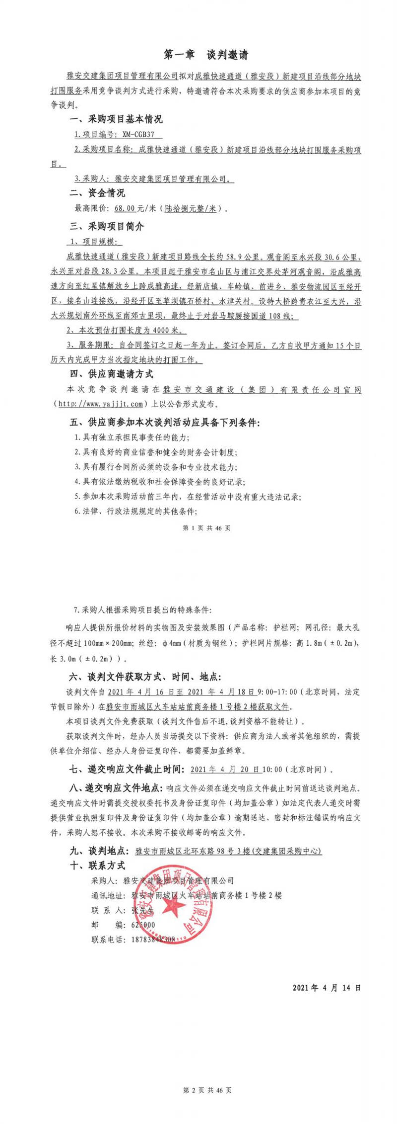 雅安交建集團項目管理有限公司成雅快速通道(雅安段)新建項目沿線部分地塊打圍服務采購項目競爭談判公告
