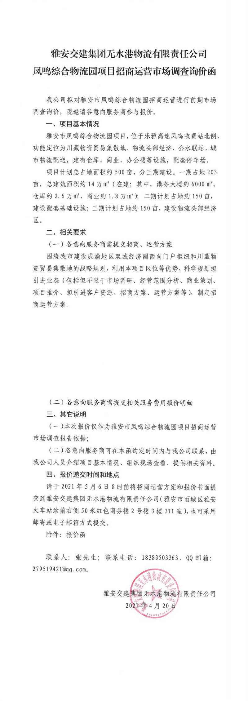 雅安交建集團無水港物流有限責任公司鳳鳴綜合物流園項目招商運營市場調查詢價函
