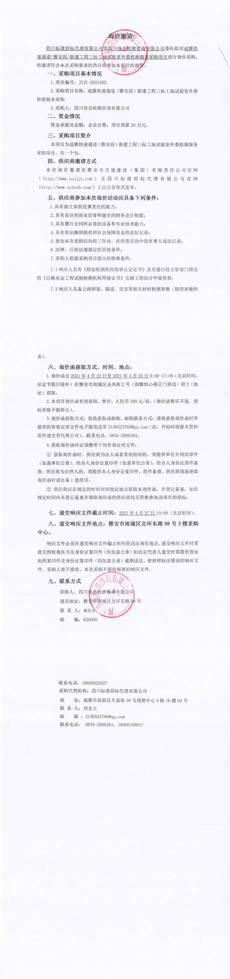 四川佳岳檢測咨詢有限公司成雅快速通道(雅安段)新建工程三標(biāo)工地試驗室外委檢測服務(wù)采購詢價公告