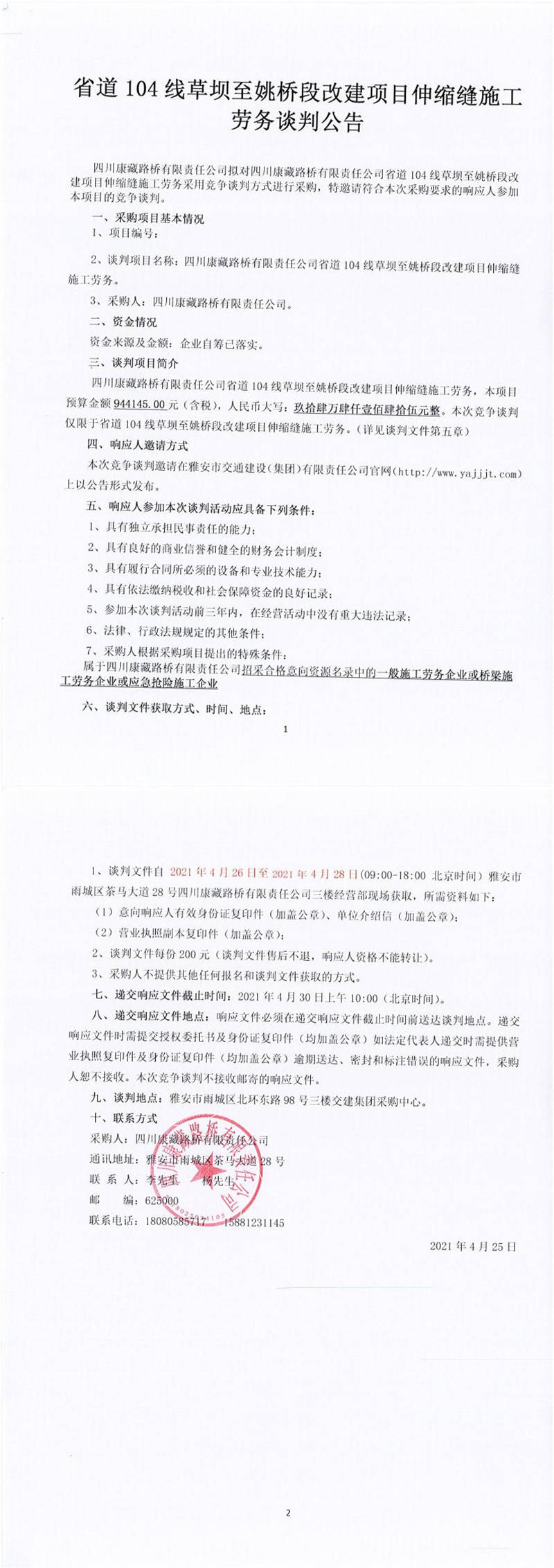 四川康藏路橋有限責任公司省道104線草壩至姚橋段改建項目伸縮縫施工勞務(wù)談判公告