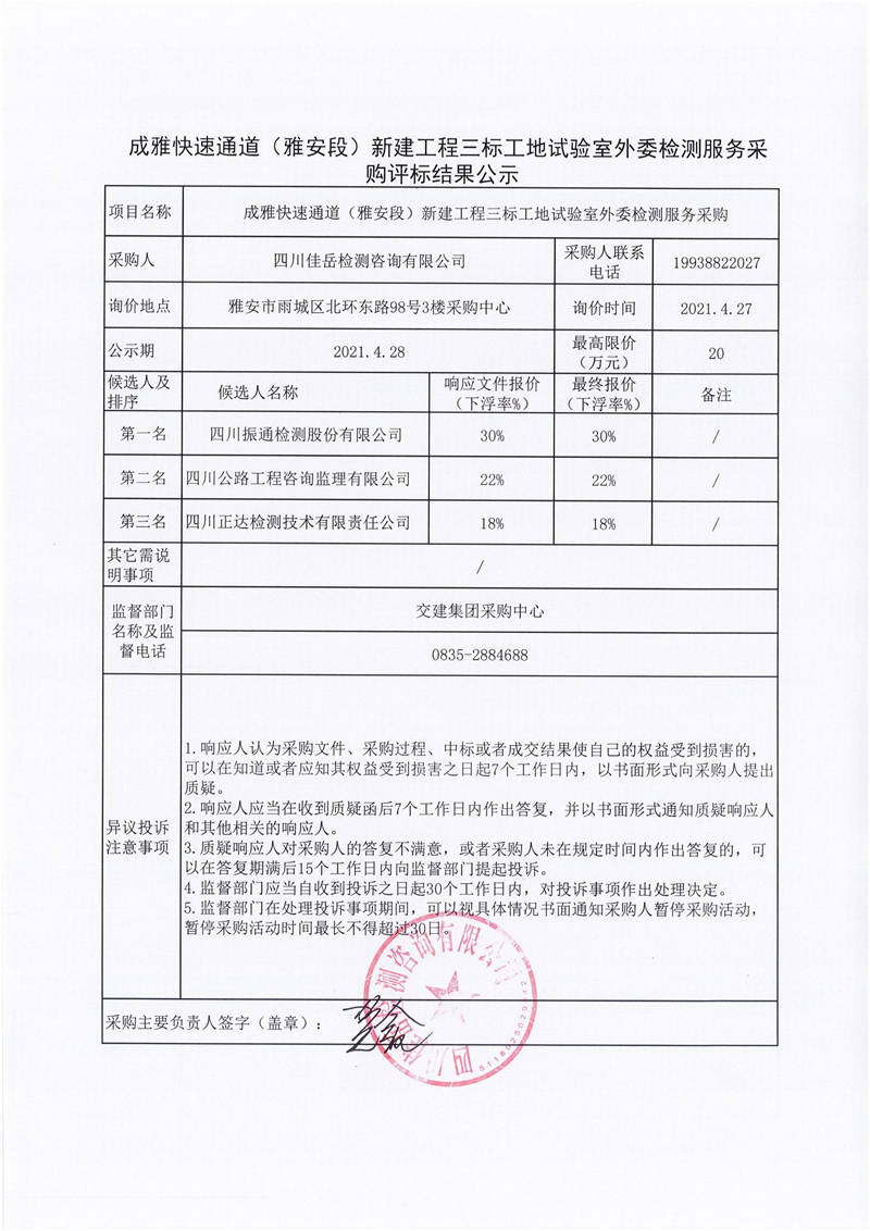 四川佳岳檢測(cè)咨詢(xún)有限公司成雅快速通道(雅安段)新建工程三標(biāo)工地試驗(yàn)室外委檢測(cè)服務(wù)采購(gòu)評(píng)標(biāo)結(jié)果公示