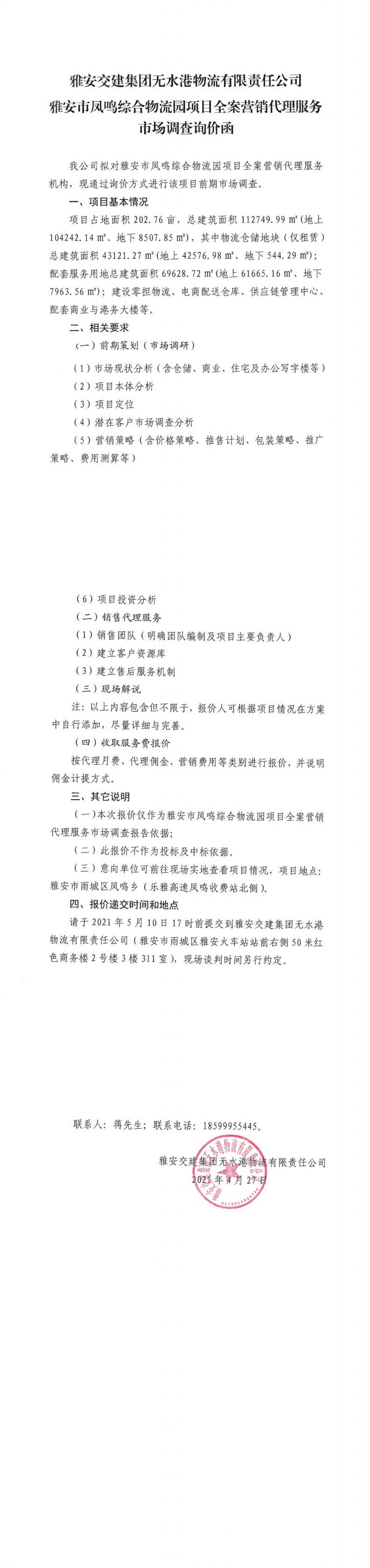 雅安交建集團無水港物流有限責(zé)任公司雅安市鳳鳴綜合物流園項目全案營銷代理服務(wù)市場調(diào)查詢價函