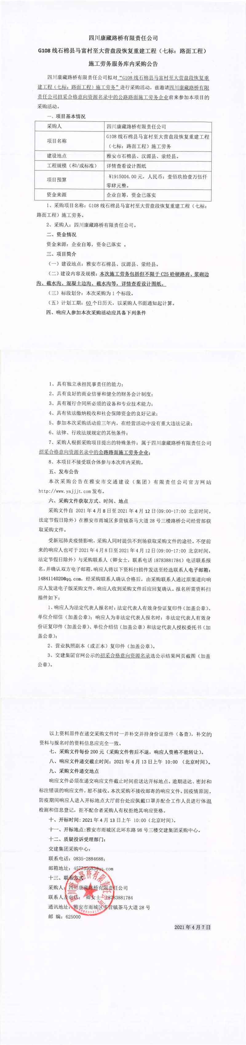 四川康藏路橋有限責任公司G108線石棉縣馬富村至大營盤段恢復重建工程(七標:路面工程)施工勞務服務庫內(nèi)采購公告