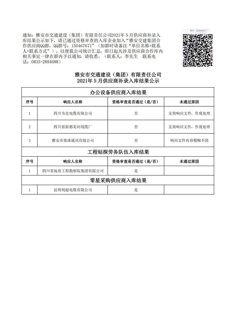 雅安市交通建設(shè)(集團(tuán))有限責(zé)任公司2021年5月供應(yīng)商補(bǔ)錄入庫(kù)結(jié)果公示