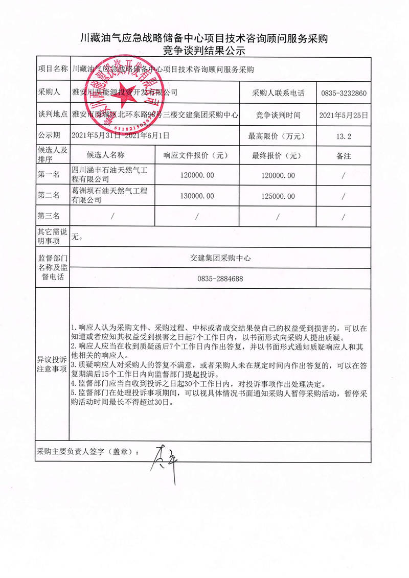 雅安川西能源投資開發(fā)有限公司川藏油氣應急戰(zhàn)略儲備中心項目技術(shù)咨詢顧問服務采購競爭談判結(jié)果公示