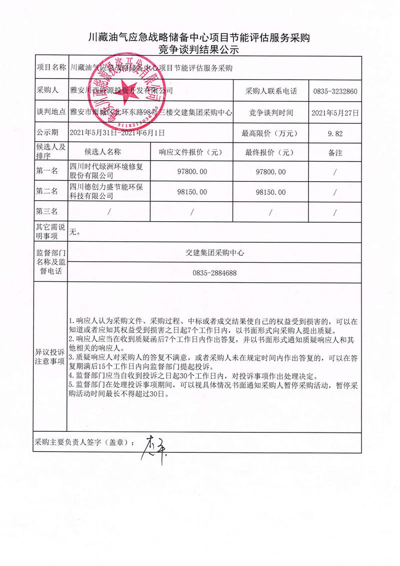雅安川西能源投資開(kāi)發(fā)有限公司川藏油氣應(yīng)急戰(zhàn)略儲(chǔ)備中心項(xiàng)目節(jié)能評(píng)估服務(wù)采購(gòu)競(jìng)爭(zhēng)談判結(jié)果公示