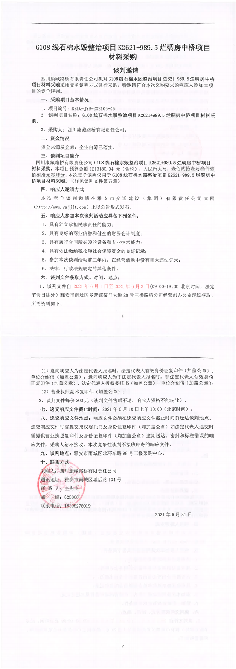四川康藏路橋有限責(zé)任公司G108線石棉水毀整治項(xiàng)目K2621+989.5爛碉房中橋項(xiàng)目材料采購競(jìng)爭(zhēng)談判公告
