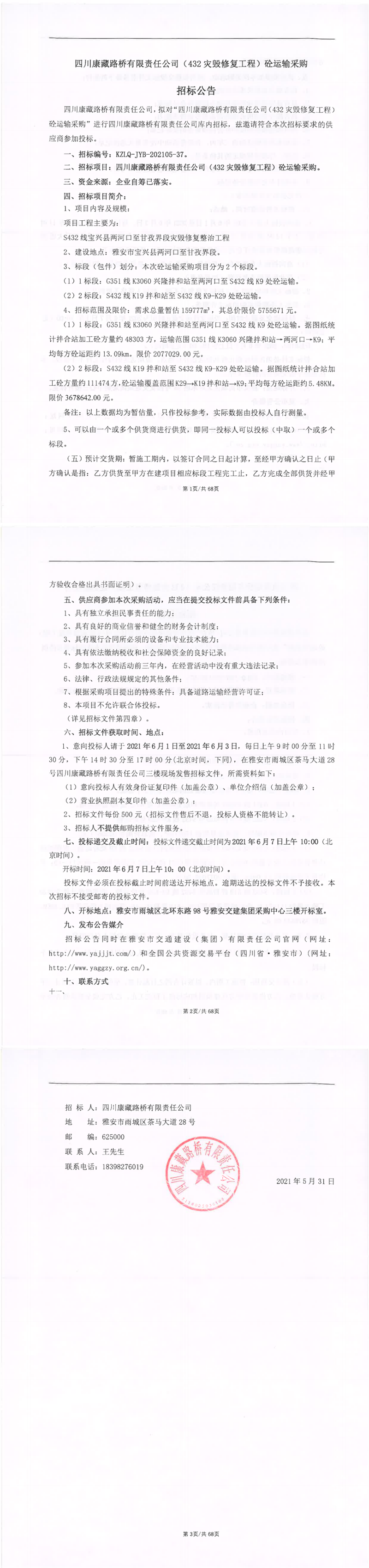四川康藏路橋有限責任公司(432災(zāi)毀修復(fù)工程)砼運輸采購招標公告