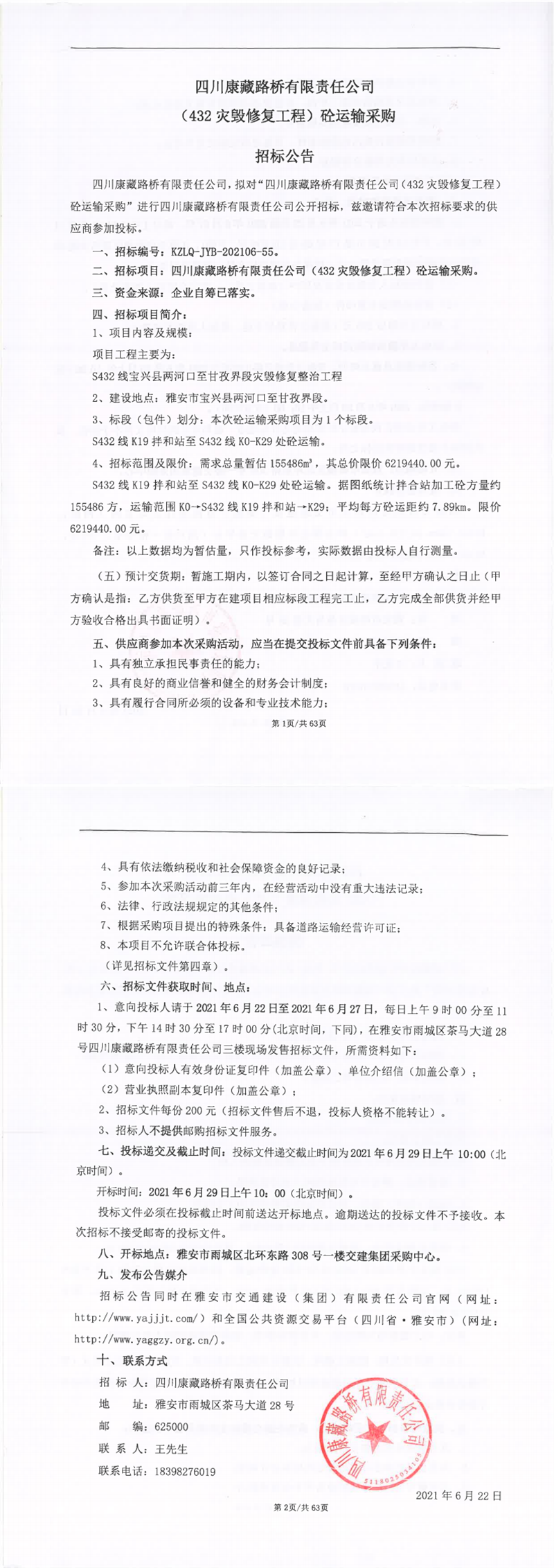 四川康藏路橋有限責任公司(432災(zāi)毀修復(fù)工程)砼運輸采購招標公告