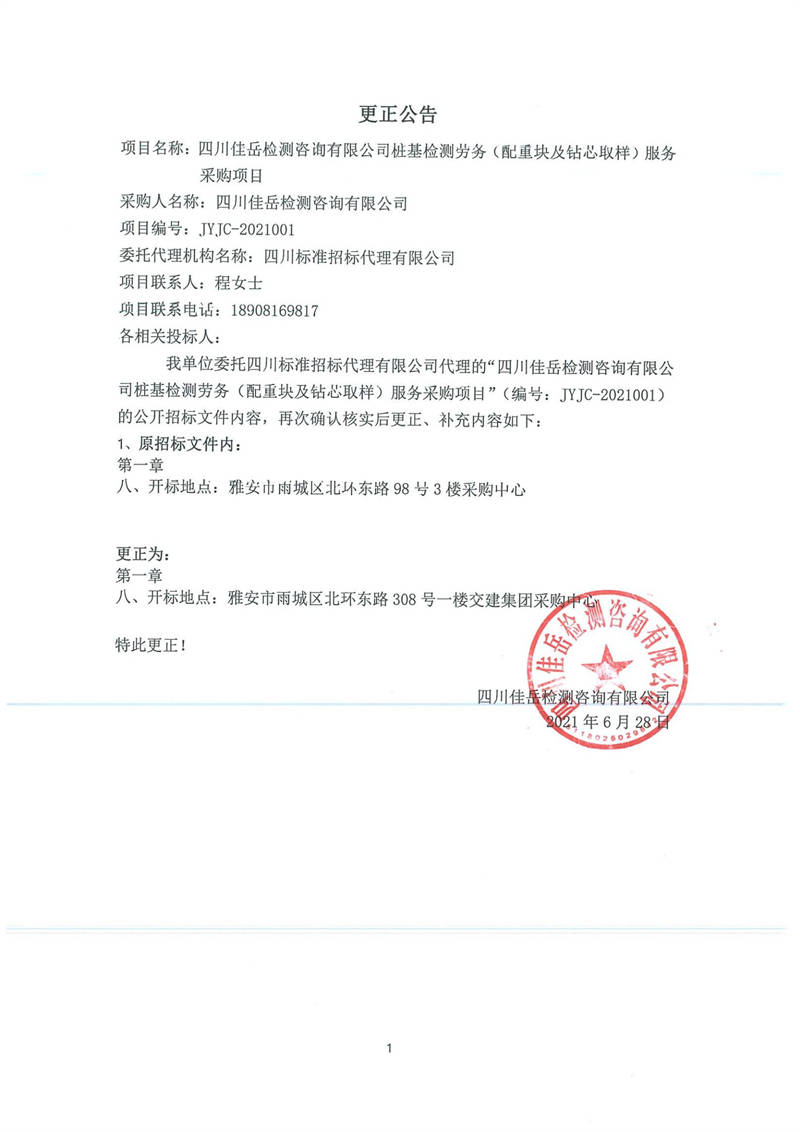 四川佳岳檢測咨詢有限公司樁基檢測勞務(wù)(配重塊及鉆芯取樣)服務(wù)采購項目更正公告
