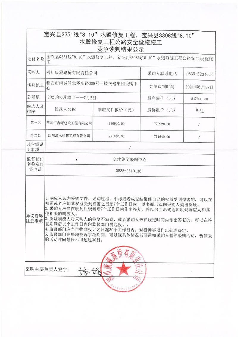 四川康藏路橋有限責(zé)任公司寶興縣G351線“8.10”水毀修復(fù)工程,寶興縣S308線水毀修復(fù)工程公路安全設(shè)施施工競(jìng)爭(zhēng)談判結(jié)果公示