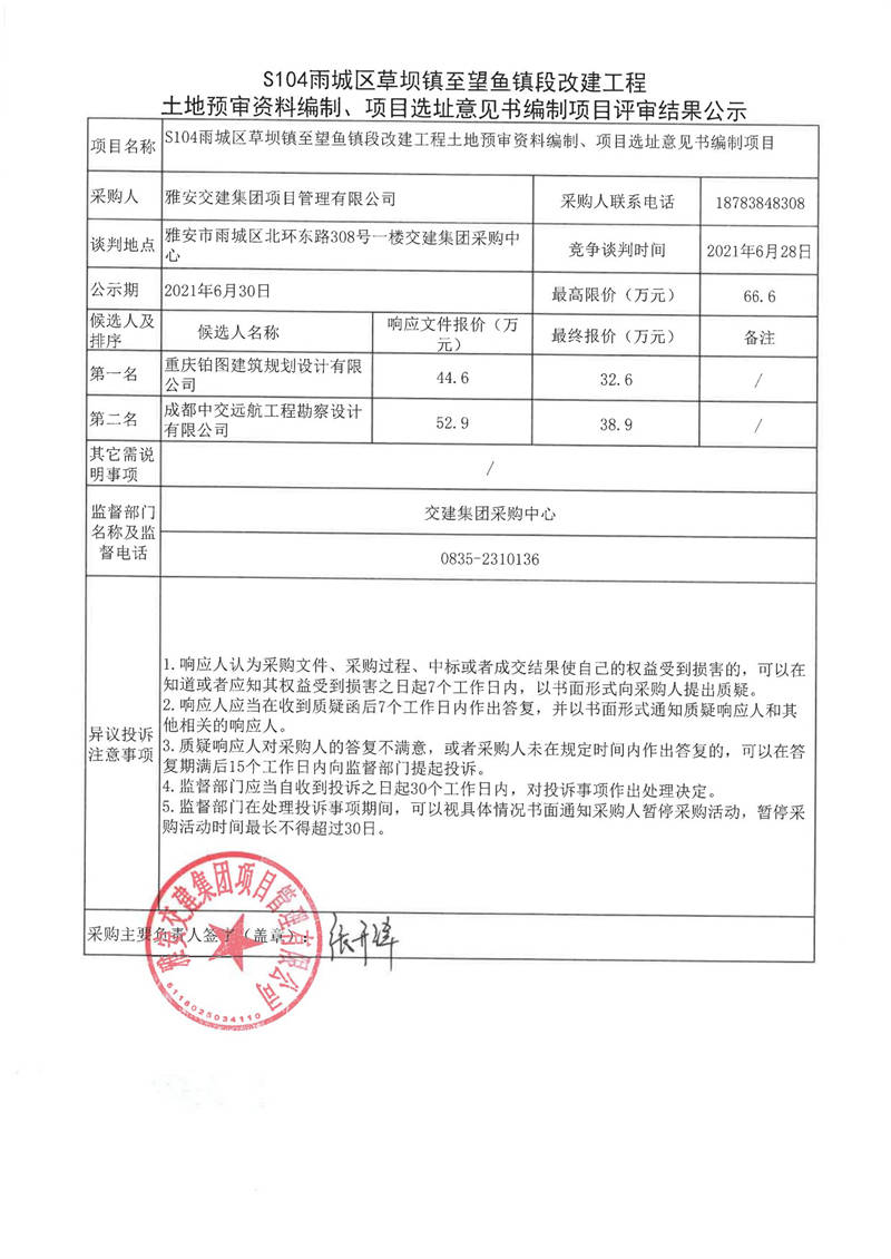 雅安交建集團項目管理有限公司S104雨城區(qū)草壩鎮(zhèn)至望魚鎮(zhèn)段改建工程土地預審資料編制、項目選址意見書編制項目評審結果公示