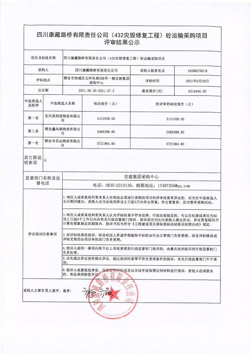 四川康藏路橋有限責任公司S432線寶興縣兩河口至甘孜界段災(zāi)毀修復(fù)整治工程砼運輸采購項目評審結(jié)果公示