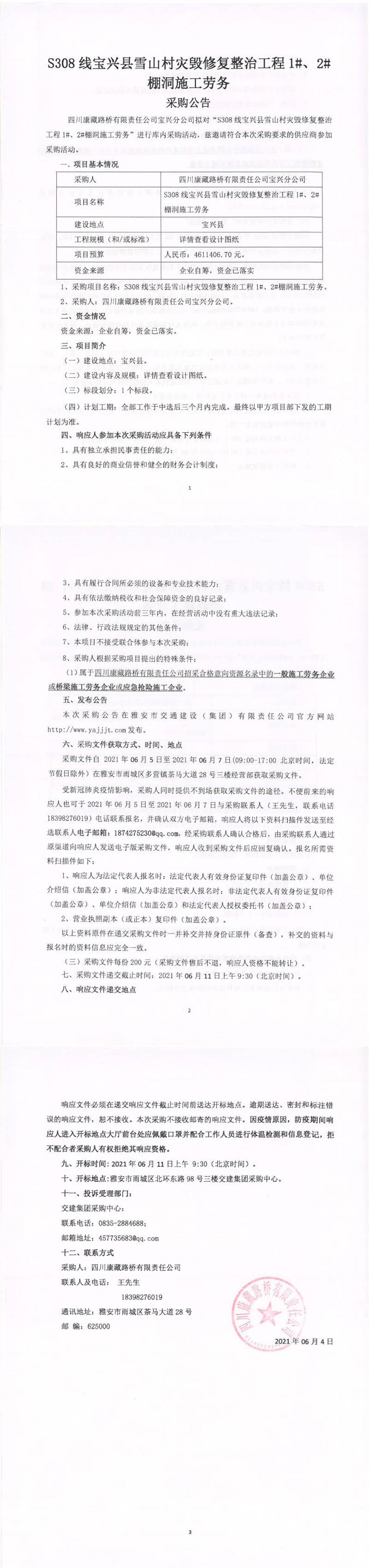 四川康藏路橋有限責任公司S308線寶興縣雪山村災毀修復整治工程1#、2#棚洞施工勞務采購公告