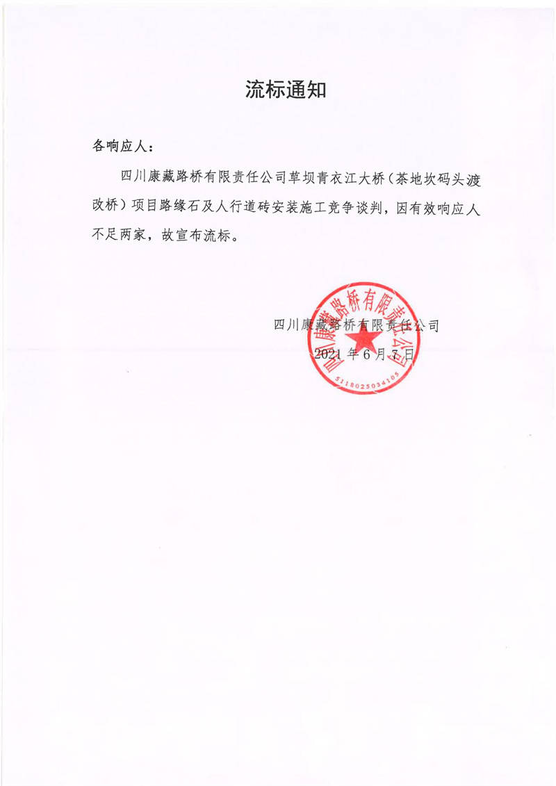 四川康藏路橋有限責(zé)任公司草壩青衣江大橋(茶地坎碼頭渡改橋)項目路緣石及人行道磚安裝施工競爭談判流標(biāo)通知