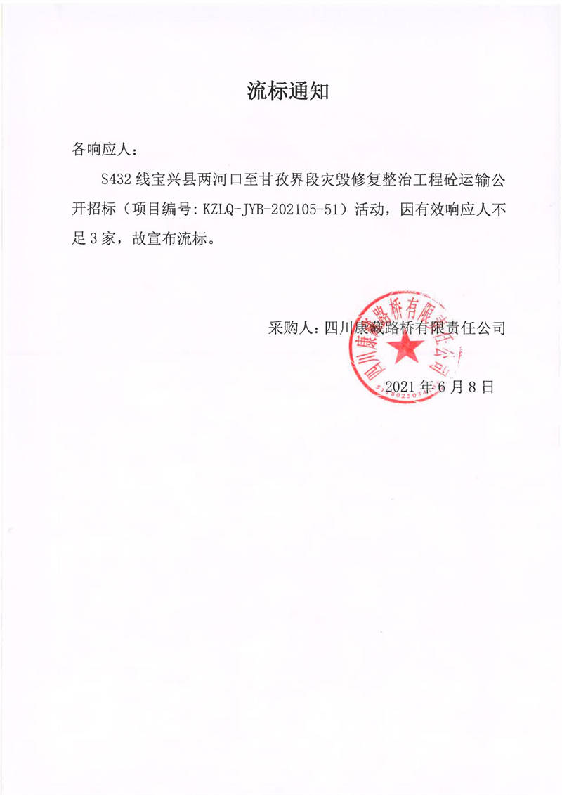四川康藏路橋有限責(zé)任公司S432線寶興縣兩河口至甘孜界段災(zāi)毀修復(fù)整治工程砼運(yùn)輸流標(biāo)通知