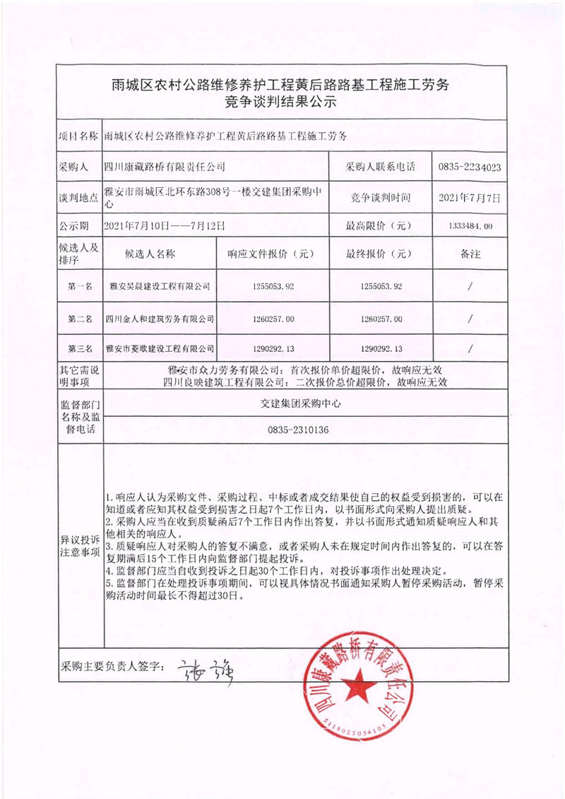 四川康藏路橋有限責任公司雨城區(qū)農(nóng)村公路維修養(yǎng)護工程黃后路路基工程施工勞務競爭談判結(jié)果公示