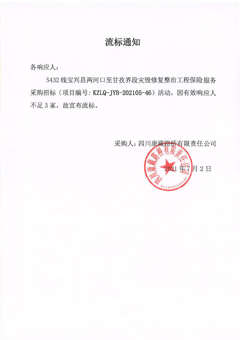 四川康藏路橋有限責(zé)任公司S432線寶興縣兩河口至甘孜界段災(zāi)毀修復(fù)整治工程保險(xiǎn)服務(wù)采購(gòu)流標(biāo)通知