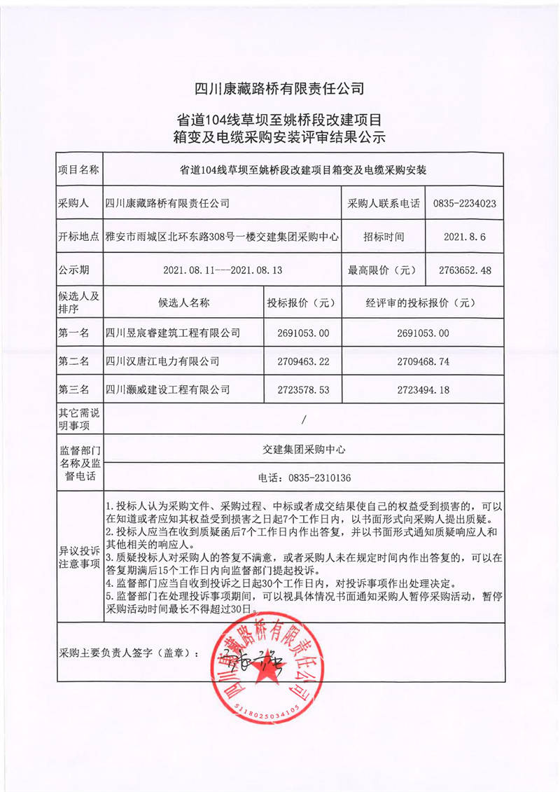 四川康藏路橋有限責(zé)任公司省道104線草壩至姚橋段改建項(xiàng)目箱變及電纜采購安裝評審結(jié)果公示