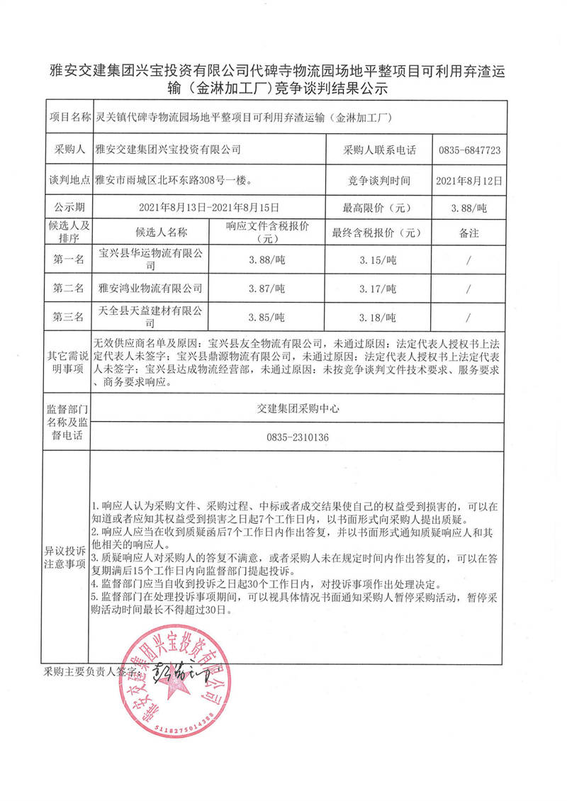 雅安交建集團興寶投資有限公司代碑寺物流園場地平整項目可利用棄渣運輸(金淋加工廠)競爭談判結(jié)果公示