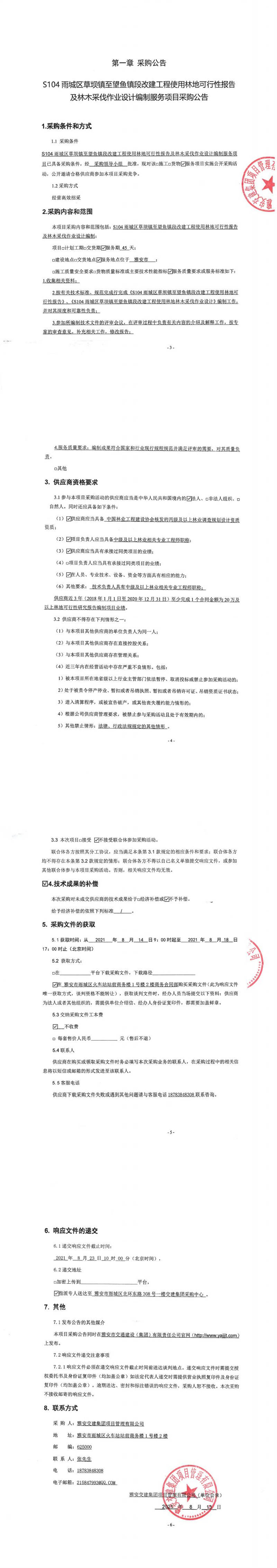 雅安交建集團項目管理有限公司S104雨城區(qū)草壩鎮(zhèn)至望魚鎮(zhèn)段改建工程使用林地可行性報告及林木采伐作業(yè)設計編制服務項目采購公告