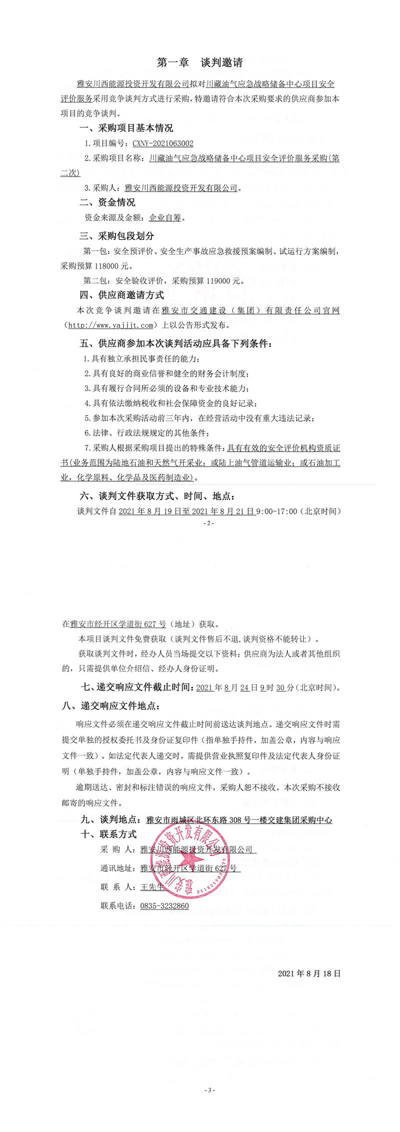 雅安川西能源投資開(kāi)發(fā)有限公司川藏油氣應(yīng)急戰(zhàn)略?xún)?chǔ)備中心項(xiàng)目安全評(píng)價(jià)服務(wù)采購(gòu)(第二次)競(jìng)爭(zhēng)談判公告