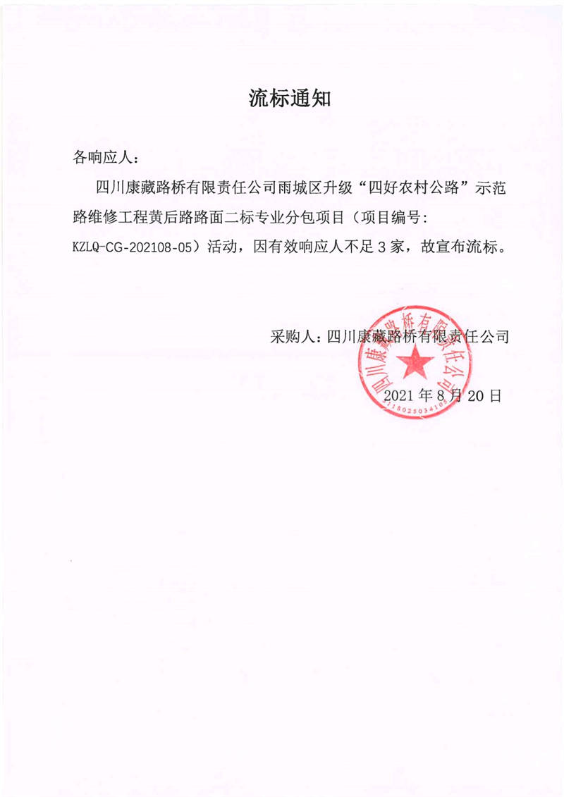 四川康藏路橋有限責(zé)任公司雨城區(qū)升級“四好農(nóng)村公路”示范路維修工程黃后路路面二標(biāo)專業(yè)分包項目流標(biāo)通知