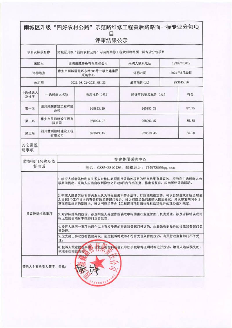四川康藏路橋有限責任公司雨城區(qū)升級“四好農村公路”示范路維修工程黃后路路面一標專業(yè)分包項目評審結果公示