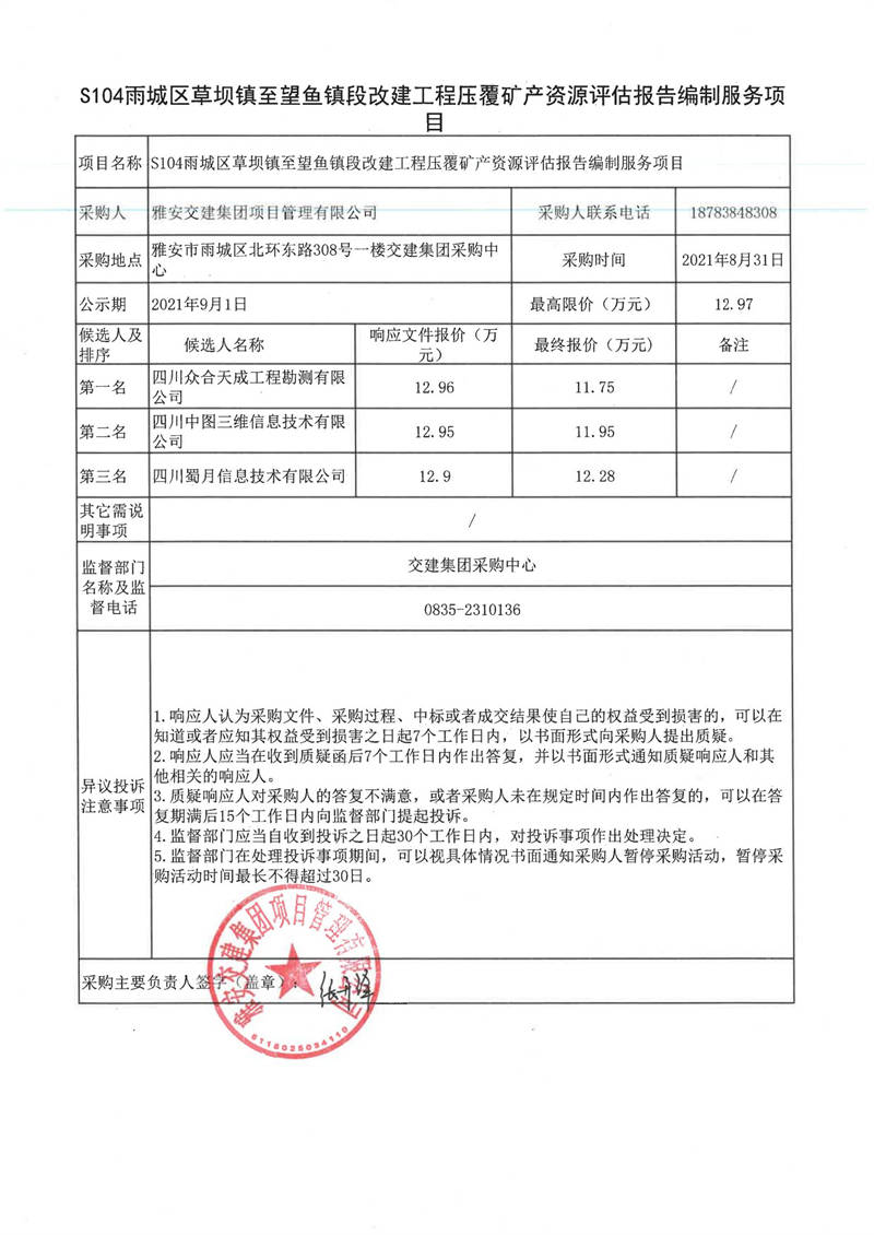 雅安交建集團(tuán)項(xiàng)目管理有限公司S104雨城區(qū)草壩鎮(zhèn)至望魚鎮(zhèn)段改建工程壓覆礦產(chǎn)資源評估報告編制服務(wù)項(xiàng)目評審結(jié)果公示
