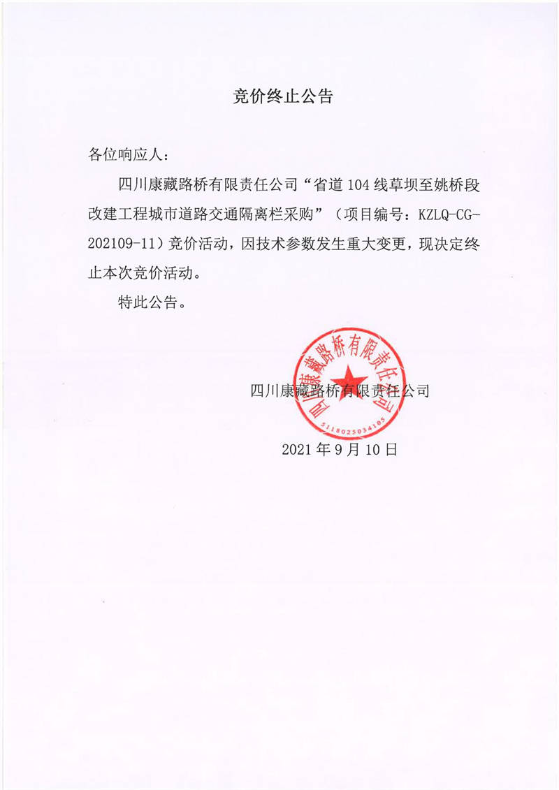 四川康藏路橋有限責(zé)任公司省道104線草壩至姚橋段改建工程城市道路交通隔離欄采購競(jìng)價(jià)終止公告