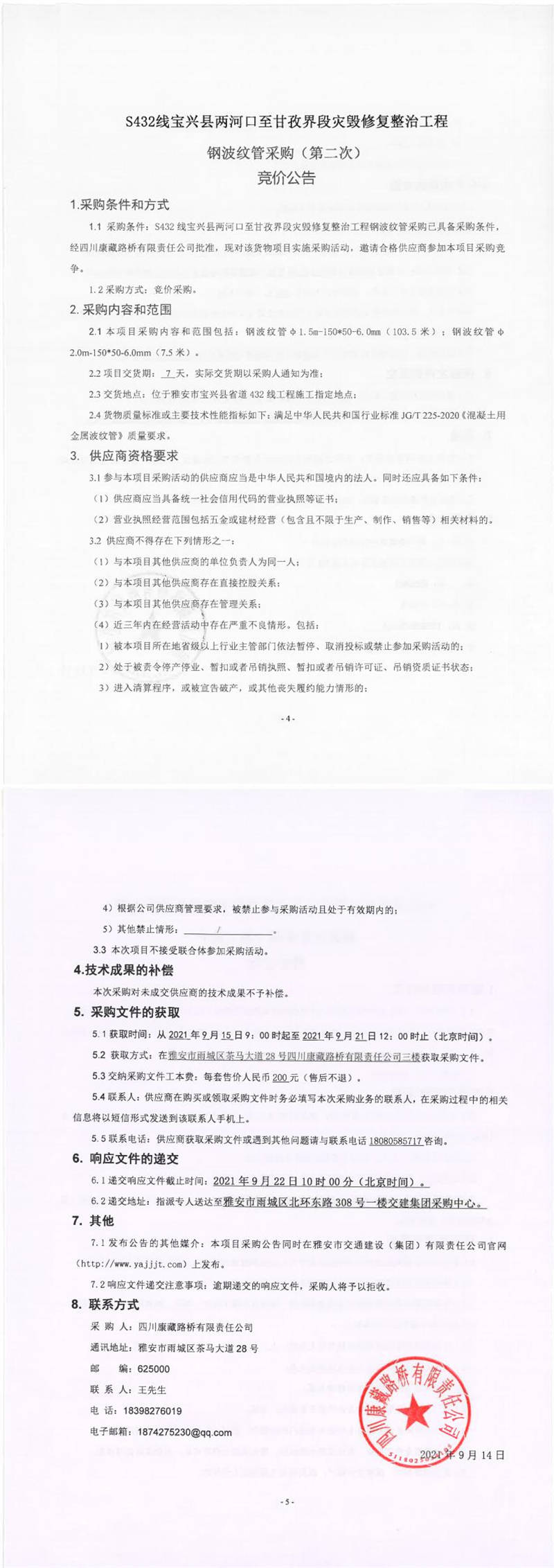 四川康藏路橋有限責(zé)任公司S432線寶興縣兩河口至甘孜界段災(zāi)毀修復(fù)整治工程鋼波紋管采購(第二次)競價(jià)公告
