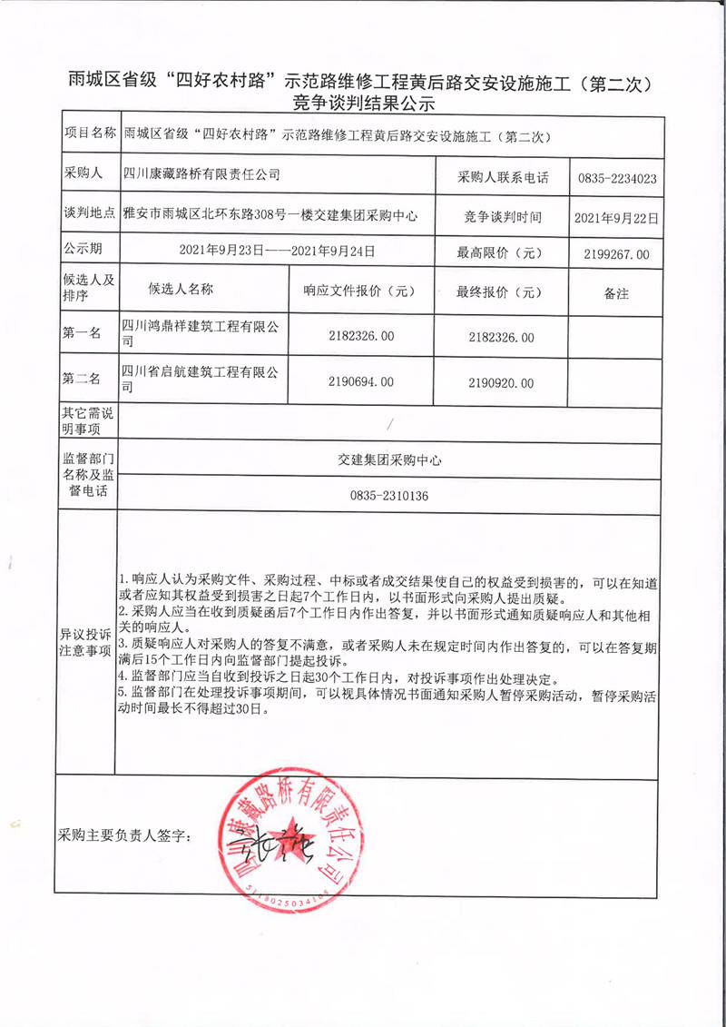 四川康藏路橋有限責任公司雨城區(qū)省級“四好農村路”示范路維修工程黃后路交安設施施工(第二次)競爭談判結果公示