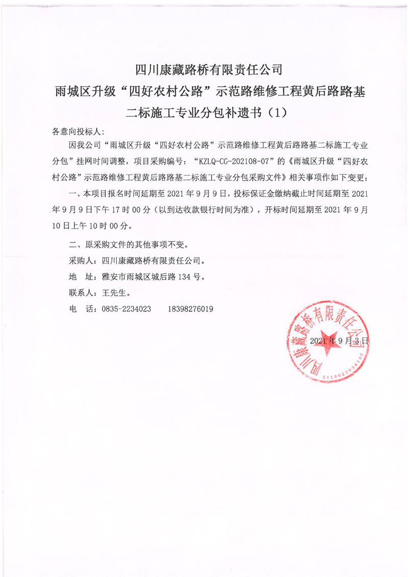 四川康藏路橋有限責任公司雨城區(qū)升級“四好農(nóng)材公路”示范路維修工程黃后路路基二標施工專業(yè)分包補遺書(1)