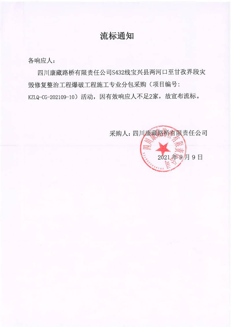 四川康藏路橋有限責(zé)任公司S432線寶興縣兩河口至甘孜界段災(zāi)毀修復(fù)整治工程爆破工程施工專業(yè)分包采購流標(biāo)通知